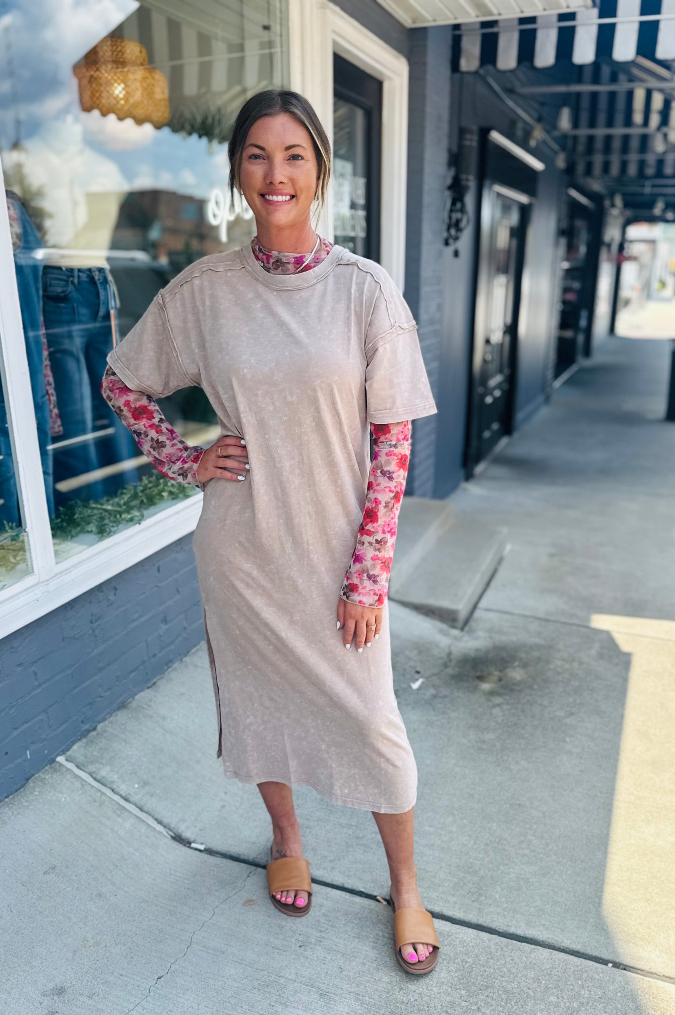 - Mineral Washed Casual Comfy Midi Dress - Oversized - Side Slit - Round Neck - Drop Shoulder - Short Sleeve - Raw Edge Detail - Loungewear - Back Pleat Detail (