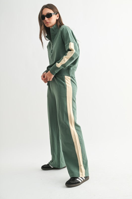 Sporty meets cozy in this 2-piece cotton set featuring wide-leg sweatpants and a mock neck half-zip pullover. Designed with bold contrast stripes down the sleeves and pant legs for an athletic touch, this set is finished with ribbed cuffs, hem, collar, and waistband for a snug, structured feel. The sweatpants feature a comfy drawstring waistband, side pockets, and a relaxed wide-leg silhouette. The pullover has drop-shoulder sleeves for an effortless, laid-back vibe-perfect for lounging or stepping out in style.Sporty meets cozy in this 2-piece cotton set featuring wide-leg sweatpants and a mock neck half-zip pullover.